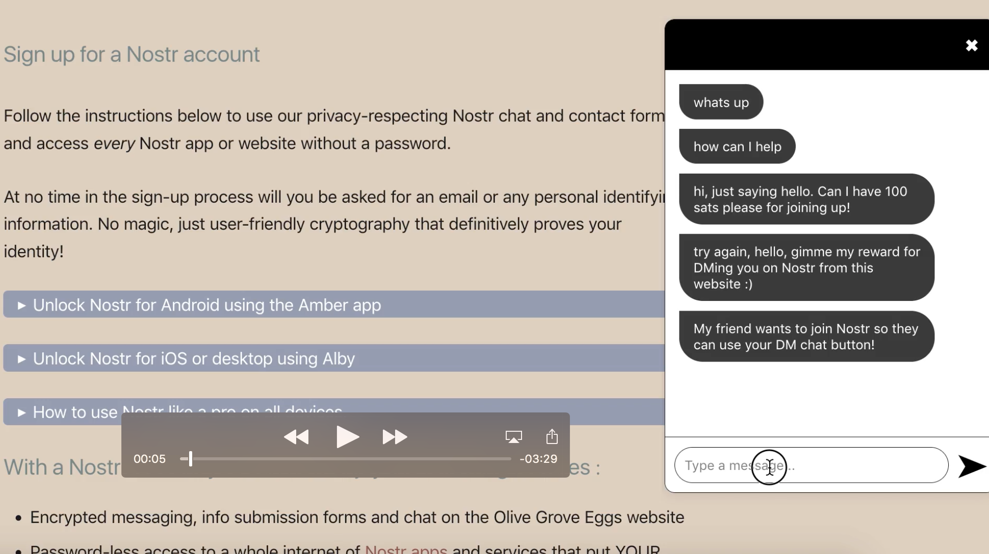 To use the chat button requires Nostr users to have a browser extension installed, like Alby, Amber, Nos2x-fox, or Flamingo, to automatically sign the post (event).